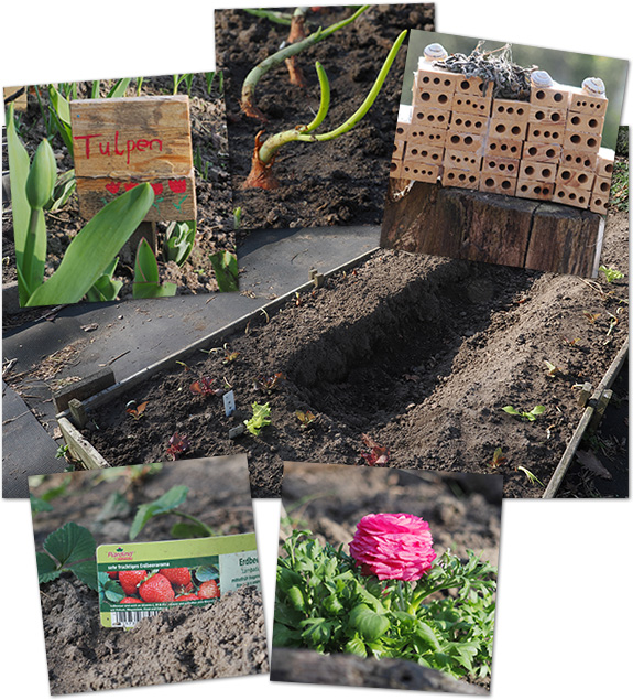 Ganz langsam, aber unaufhaltsam, kommt der Frühling. Nach und nach werden nun unsere Schulbeete wieder aufgedeckt und mit den ersten Pflanzen bestückt. Jede Klasse hat hier ihr eigenes Beet und so entsteht ein bunter kleiner Garten aus Nutz- und Zierpflanzen. Und natürlich darf auch ein Insektenhotel hier nicht fehlen.