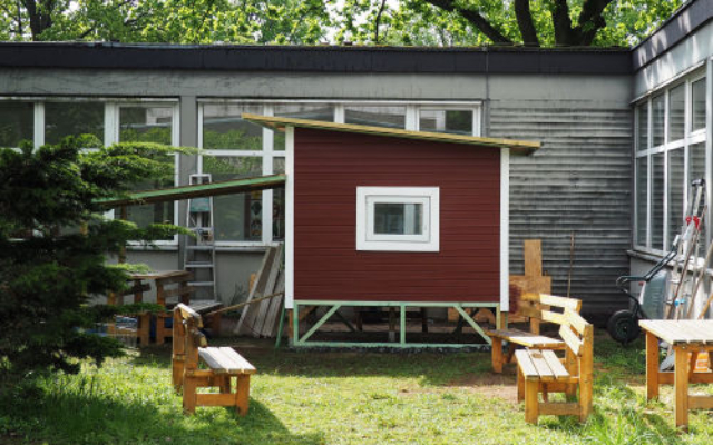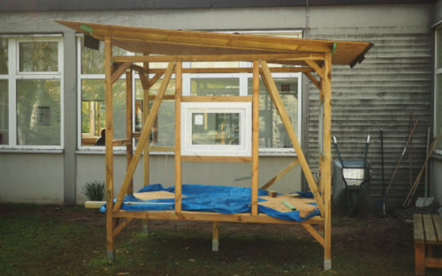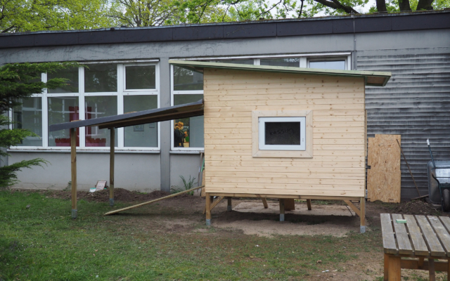 Wochenlang haben unser Sportlehrer Herr Kazem und unser Hausmeister Herr Bruzi an dem super Luxus-Hühnerhaus gebaut. Viele Wagenladungen Holz haben sie aus dem Baumarkt verarbeitet, Fenster eingebaut, eine automatische Hühnertür, die morgens auf und abends wieder zugeht eingesetzt und sogar eine Beleuchtung angebracht.