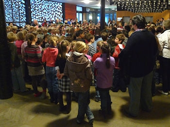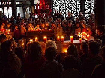 Das Advent-Singen hat an unserer Schule eine lange Tradition. Immer montags nach den Advent-Sonntagen treffen sich die Schülerinnen und Schüler aller Klassen vor dem Unterricht um 8.15 Uhr im Vorraum unserer Aula zum Advent-Singen. Im Lichtschein vieler Kerzen werden weihnachtliche Lieder gesungen. Einige Lieder werden auch mit Instrumenten begleitet. Unser Schulchor kennt die Lieder, die gesungen werden, besonders gut. Das gemeinsame Singen dauert immer ca. 15 Minuten. Mittlerweile finden sich auch immer mehr Zuhörer ein, die die weihnachtliche Stimmung genießen.