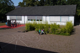 - Dies ist unser Pavillon: dort befinden sich zwei Klassen, drei OGS-Räume sowie ein Förderraum. Der Zugang zum Pavillon ist behindertengerecht mit einer Rampe ausgestattet.