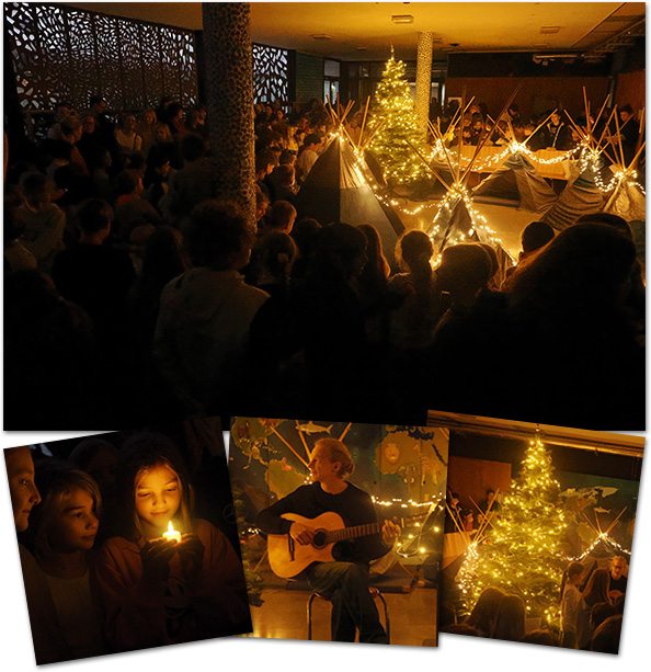 Und nun ein wenig der Höhepunkt unserer Adventszeit. Eingeübt und angeleitet durch unseren Musiklehrer Herr Hoheisel, singt die ganze Schule vor dem Unterricht eine kleine Reihe von Weihnachtsliedern. Alle Eltern sind dazu immer herzlich eingeladen, auch diese Wochentage mit uns zusammen besinnlich zu beginnen.