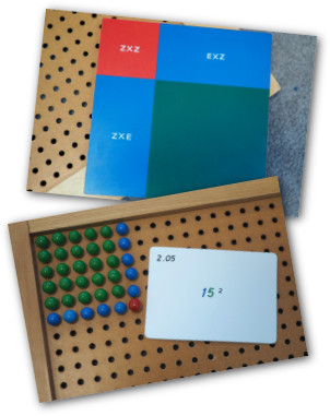 Wir haben ein Material, das heißt Wurzelbrett. Mit diesem Material können wir Quadratzahlen und Wurzelziehen rechnen.